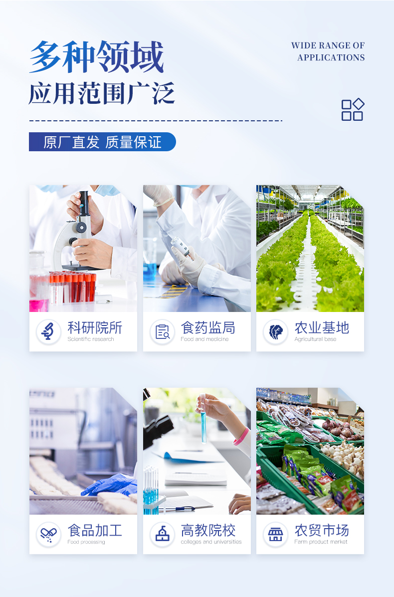 此外還可用于果蔬茶生產(chǎn)基地和農(nóng)貿(mào)批發(fā)銷售市場現(xiàn)場檢測,餐館、學(xué)校、食堂、家庭果蔬加工前的安全速測等。