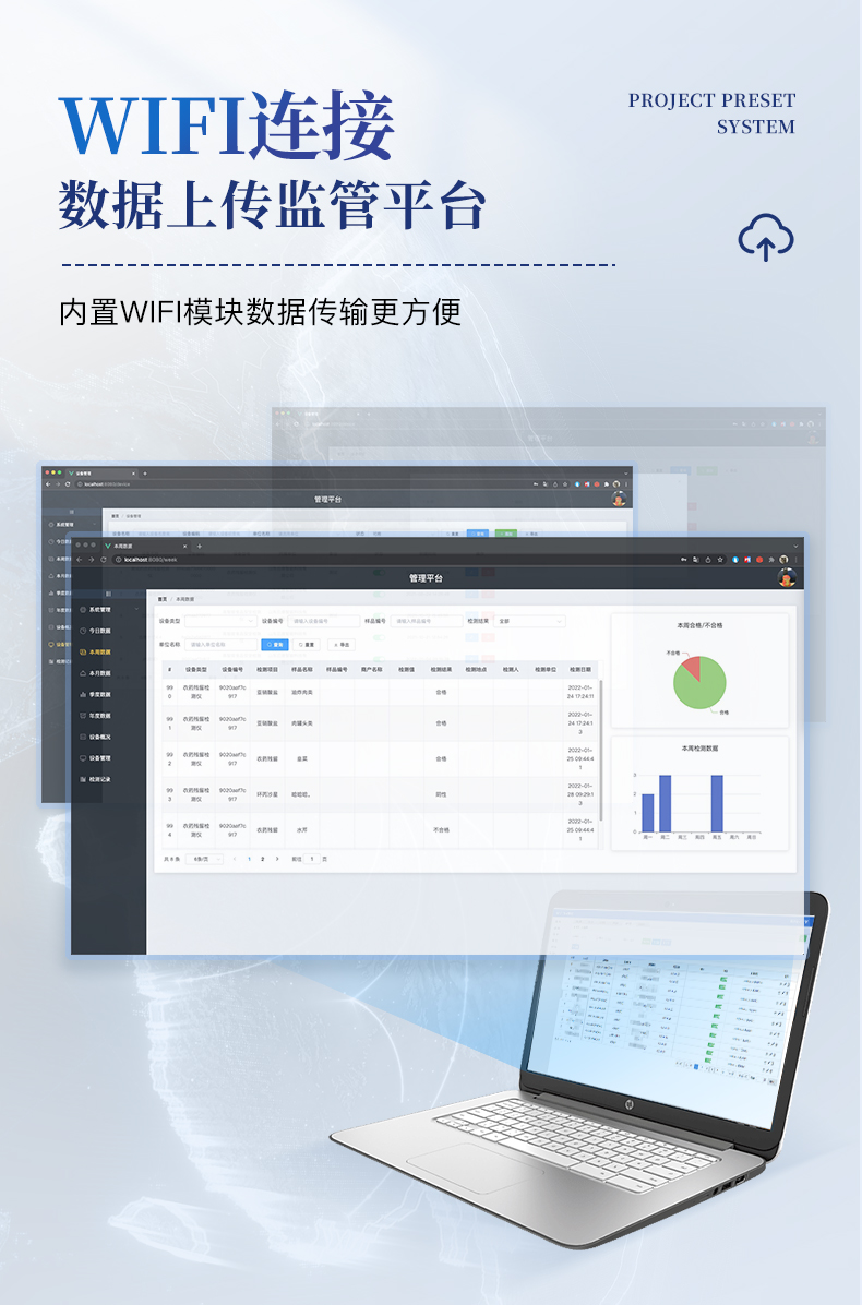 9、支持Wifi網(wǎng)絡(luò),數(shù)據(jù)可局域網(wǎng)和互聯(lián)網(wǎng)數(shù)據(jù)上傳,檢測結(jié)果直接傳至食品安全監(jiān)管平臺。進行區(qū)域食品安全監(jiān)管及大數(shù)據(jù)分析處理,檢測區(qū)域食品安全長短期動態(tài),達到食品安全問題預(yù)估、預(yù)警