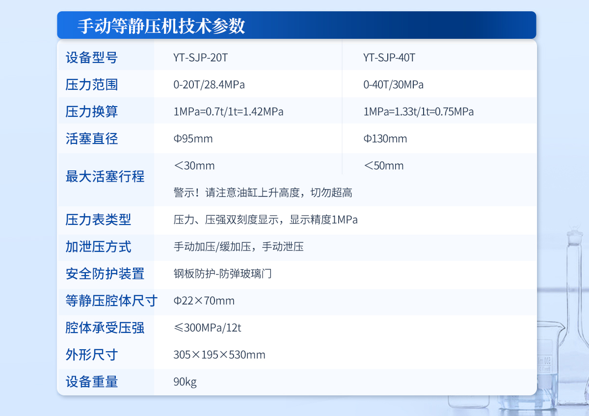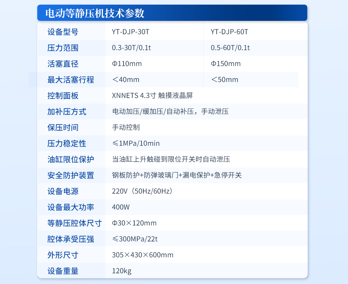 規(guī)格型號(hào):YT-ZJP-30T | 壓力范圍:0.3-30T/0.1t | 活塞直徑 :Φ110mm | **油缸行程:<30mm | 加壓方式:自動(dòng)加壓/緩加壓 | 加壓制樣過(guò)程:自動(dòng)加壓--自動(dòng)保壓--精準(zhǔn)補(bǔ)壓--定時(shí)泄壓 | 加壓段數(shù):5段任意設(shè)置 | 保壓時(shí)間 :不限時(shí)N秒,每段均可設(shè)置不同的保壓時(shí)間 | 控制面板:XNNETS 7寸 觸摸液晶屏(遠(yuǎn)程控制可選配) | 觸屏功能模塊:壓力系-統(tǒng)-數(shù)據(jù)管理系統(tǒng)--中英文界面互換等(USB可升級(jí)) | 模具壓強(qiáng)換算:實(shí)時(shí)自動(dòng)計(jì)算樣品承受壓強(qiáng)(MPa) | 油缸限位保護(hù):當(dāng)油缸上升觸碰到限位開關(guān)時(shí)自動(dòng)泄壓 | 系統(tǒng)安全配置:當(dāng)系統(tǒng)壓強(qiáng)超過(guò)安全值時(shí)自動(dòng)泄壓 | 安全防護(hù)裝置:鋼板防護(hù)+防彈玻璃門+漏電保護(hù)+急停開關(guān) | 設(shè)備電源:220V(50Hz/60Hz) | 設(shè)備**功率:400W | 等靜壓腔體尺寸:Φ30×150mm | 腔體承受壓強(qiáng):≤300MPa/22t | 外形尺寸:240×390×560mm | 設(shè)備重量:120kg | 配置說(shuō)明:等靜壓機(jī)1臺(tái)!可根據(jù)需求定制500MPa等靜壓機(jī)或橡膠模具 |