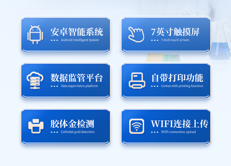 | 安卓智能操作系統(tǒng),采用更加**和人性化操作,儀器具有wifi聯(lián)網(wǎng)上傳、4G聯(lián)網(wǎng)傳輸、GPRS無線遠傳、網(wǎng)線連接功能,快速上傳數(shù)據(jù)。 | 智能化程度高,儀器具有自檢功能:具有開機自檢和調(diào)零功能,具有自動檢測重復性功能。 | 新一代高速熱敏打印機,檢測完成可自動打印檢測報告和二維碼。 | 儀器帶有監(jiān)管平臺,數(shù)據(jù)可局域網(wǎng)和互聯(lián)網(wǎng)數(shù)據(jù)上傳,檢測結(jié)果直接傳至食品安全監(jiān)管平臺。進行區(qū)域食品安全監(jiān)管及大數(shù)據(jù)分析處理與數(shù)據(jù)統(tǒng)計,檢測區(qū)域食品安全長短期動態(tài),達到食品安全問題預估、預警 | 一體化便攜式快檢設(shè)備,滿足現(xiàn)場及流動檢測使用需求,能夠在同一軟件下實現(xiàn)所有檢測項目的檢測,并可通過同一窗口直觀顯示檢測結(jié)果。 | 膠體金模塊檢測方式:軌道式自動傳輸掃描,檢測完成后自動退出檢測卡。 | 儀器內(nèi)置攝像頭拍照,可顯示金標卡實時圖像,系統(tǒng)自動分析并呈現(xiàn)出CT曲線圖,CT線自動識別,無需手動調(diào)整。 | 儀器具有品類多種類樣品菜單庫,可靈活選擇檢測樣品,不同的檢測通道可同時檢測不同的樣品項目。 | 樣品處理簡單省力,整體操作快速、安全、便捷。 | 高靈敏度,高檢測精度,高重復性精度,掃描式高精度光學傳感器。 | 內(nèi)置強大的數(shù)據(jù)庫,可在儀器上直接選擇樣品名稱、檢測指標、送檢單位等信息,也可在儀器上直接編輯錄入樣品名稱、檢測指標、送檢單位等信息并保存進樣品數(shù)據(jù)庫。 | 儀器具有自身保護功能,可設(shè)置用戶名及密碼,防止非工作人員操作等。 | 儀器具有重新校準、鎖定、恢復出廠設(shè)置功能。 | 結(jié)果判定線可修改,對照值標定值可保存,斷電不丟失數(shù)據(jù)。 | 兼容市場上所有的膠體金卡,使用耗材不受限制,極大增強用戶使用體驗。 |