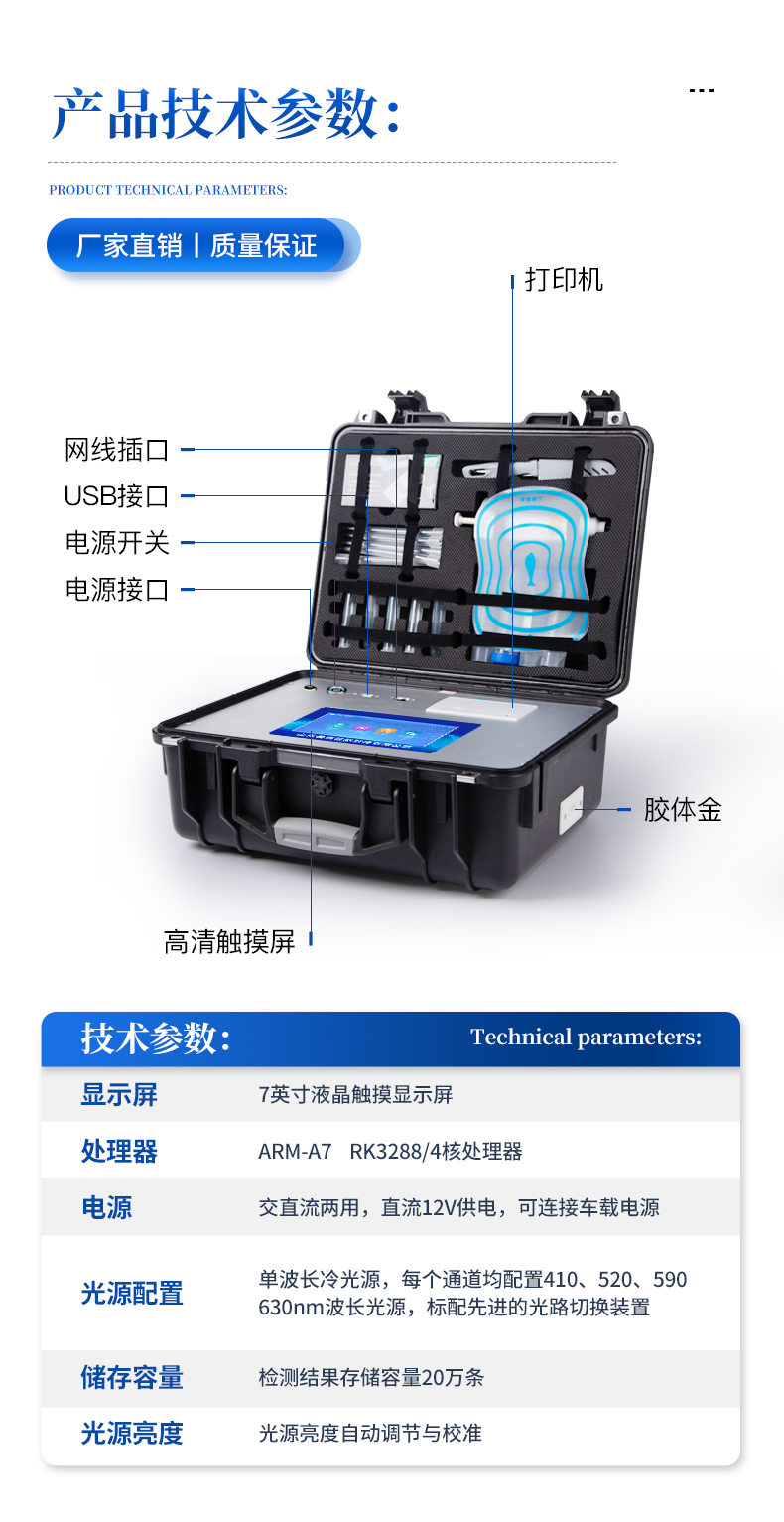 | 主控芯片采用ARM Cortex-A7,RK3288/4核處理器,主頻1.88Ghz,運轉(zhuǎn)速度更快速,穩(wěn)定性更強。 | 顯示方式:7英寸液晶觸摸屏顯示,人性化中文操作界面,讀數(shù)直觀、簡單。 | 交直流兩用,直流12V供電,可連接車載電源,可配6ah大容量充電鋰電池,方便戶外流動測試。 | 光源亮度自動調(diào)節(jié)與校準 | 智能恒流穩(wěn)壓,光強自動校準,長時間連續(xù)工作光源無溫漂現(xiàn)象。 | 內(nèi)置新國家限量標準,與所測結(jié)果進行現(xiàn)場比對,并持續(xù)更新標準。 | 不間斷進樣,連續(xù)檢測 | 樣本編號自動累加。 | 檢測項目可擴充。 | 檢測結(jié)果可批量打印,批量上傳。 | 檢測結(jié)果為Excel表格,連接電腦即可拷貝。 | 檢測結(jié)果存儲容量20萬條 | 支持U盤存儲,標準USB接口,免驅(qū)動安裝。 | 固件可升級 |