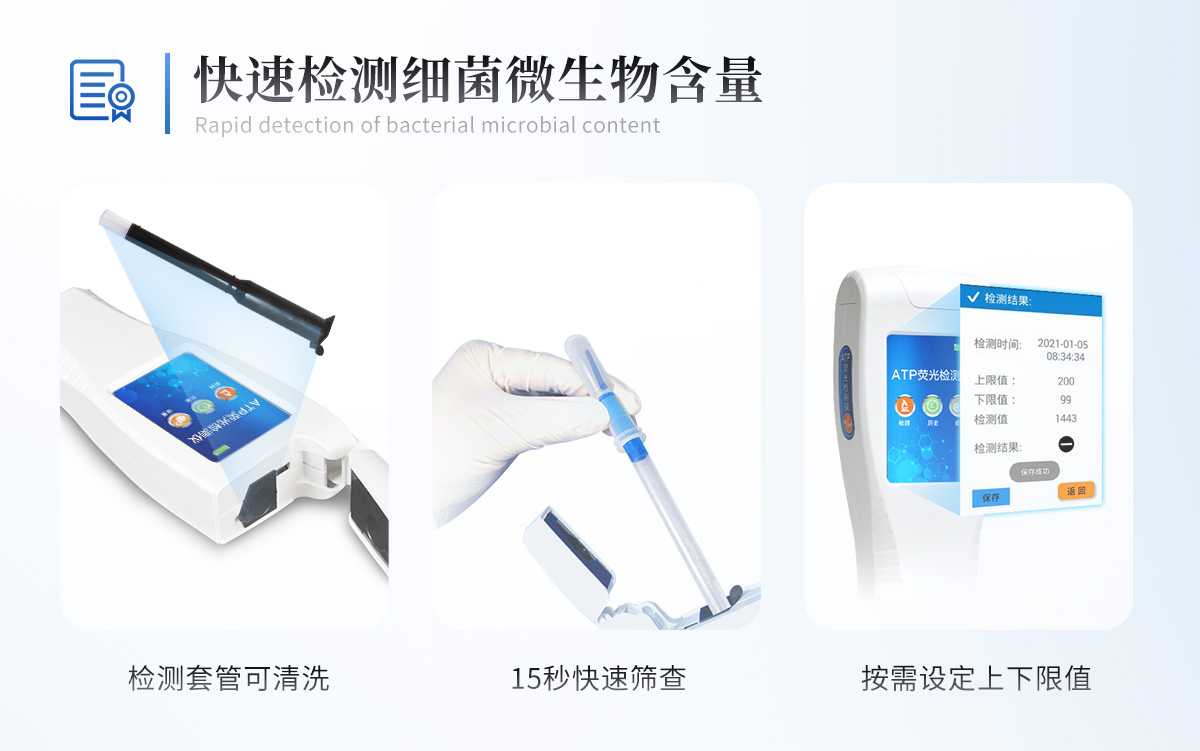 實(shí)用性 —— 可根據(jù)環(huán)境檢測需求設(shè)定上下限值,做到數(shù)據(jù)快速評估預(yù)警,表面潔凈度快速篩查。 | 靈敏度高 —— *************** | 速度快 —— 常規(guī)培養(yǎng)法18-24h以上,而ATP只需要十幾秒鐘 . | 可行性 —— 微生物數(shù)量與微生物體內(nèi)所含ATP有明確的相關(guān)性。 通過檢測ATP含量,可間接得出反應(yīng)中微生物數(shù)量 | 可操作性 —— 傳統(tǒng)培養(yǎng)方法需要在實(shí)驗(yàn)室由經(jīng)過培訓(xùn)的技術(shù)人員進(jìn)行操作;而ATP快速潔凈度檢測操作非常簡便,只需簡單的培訓(xùn)即可由一般工作人員進(jìn)行現(xiàn)場操作。 | 體驗(yàn)更好 —— 試子套管采用插拔式靈活設(shè)計,可定期清洗長期使用,延長儀器壽命。 |