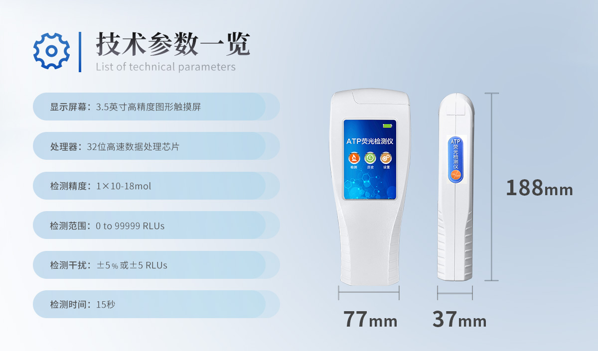 該設備為全新升級產(chǎn)品,大屏幕觸摸顯示屏,代替?zhèn)鹘y(tǒng)按鍵。操作采用生物化學反應方法檢測ATP含量,ATP熒光檢測儀基于螢火蟲發(fā)光原理,利用“熒光素酶—熒光素體系”快速檢測三磷酸腺苷(ATP)。ATP拭子含有可以裂解細胞膜的試劑,能將細胞內(nèi)ATP釋放出來,與試劑中含有的特異性酶發(fā)生反應,產(chǎn)生光,再用熒光照度計檢測發(fā)光值,微生物的數(shù)量與發(fā)光值成正比,由于所有生物活細胞中含有恒量的ATP,所以ATP含量可以清晰地表明樣品中微生物與其他生物殘余的多少,用于判斷衛(wèi)生狀況。