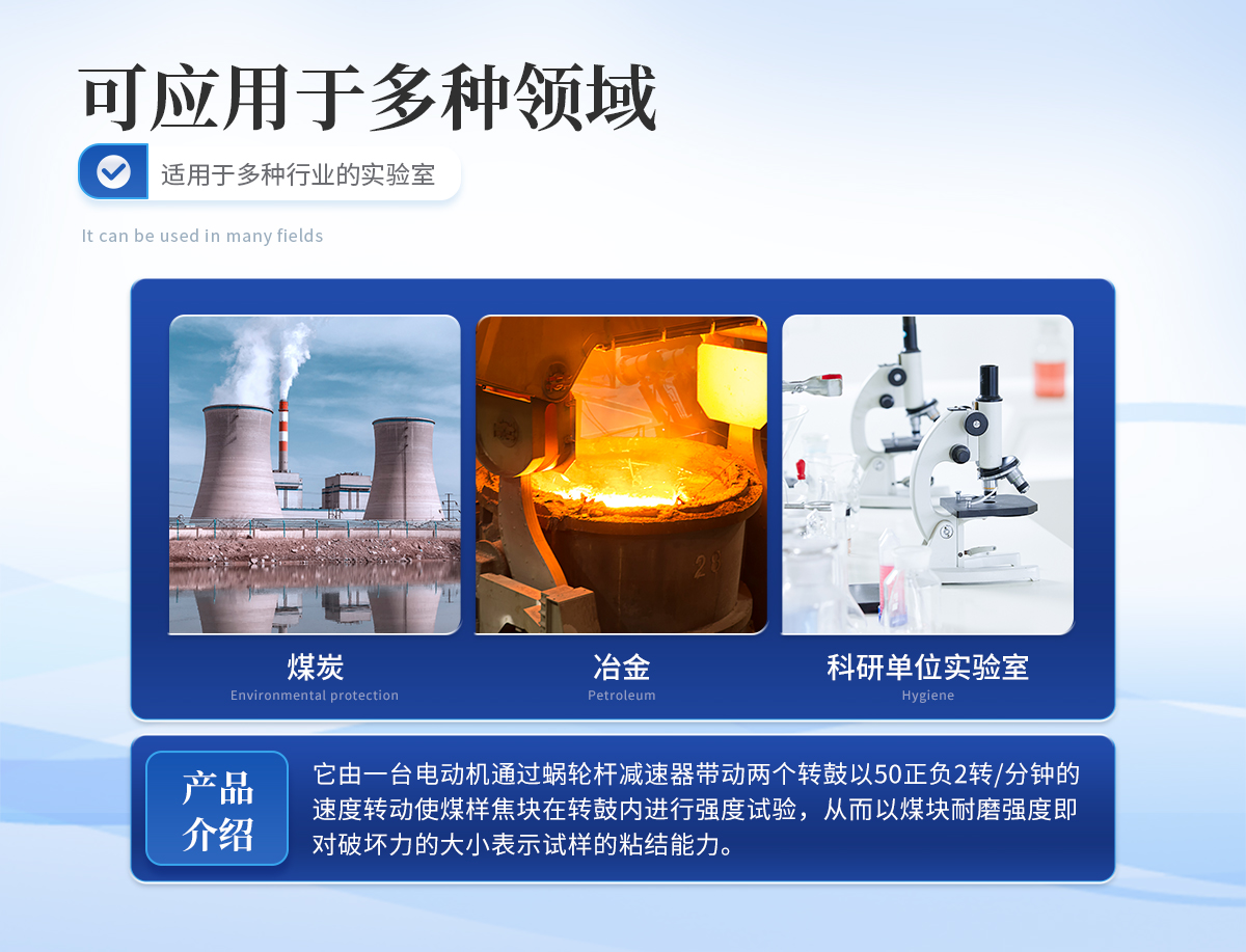該儀器是測定煉焦用煤的粘結(jié)能力——羅加指數(shù)及粘結(jié)指數(shù)的專用儀器。適用于煤炭,冶金焦化部門及科研單位的實驗室專用。它由一臺電動機通過蝸輪桿減速器帶動兩個轉(zhuǎn)鼓以50正負2轉(zhuǎn)/分鐘的速度轉(zhuǎn)動,使煤樣焦塊在轉(zhuǎn)鼓內(nèi)進行強度試驗,從而以煤塊耐磨強度——即對破壞力的大小表示試樣的粘結(jié)能力。