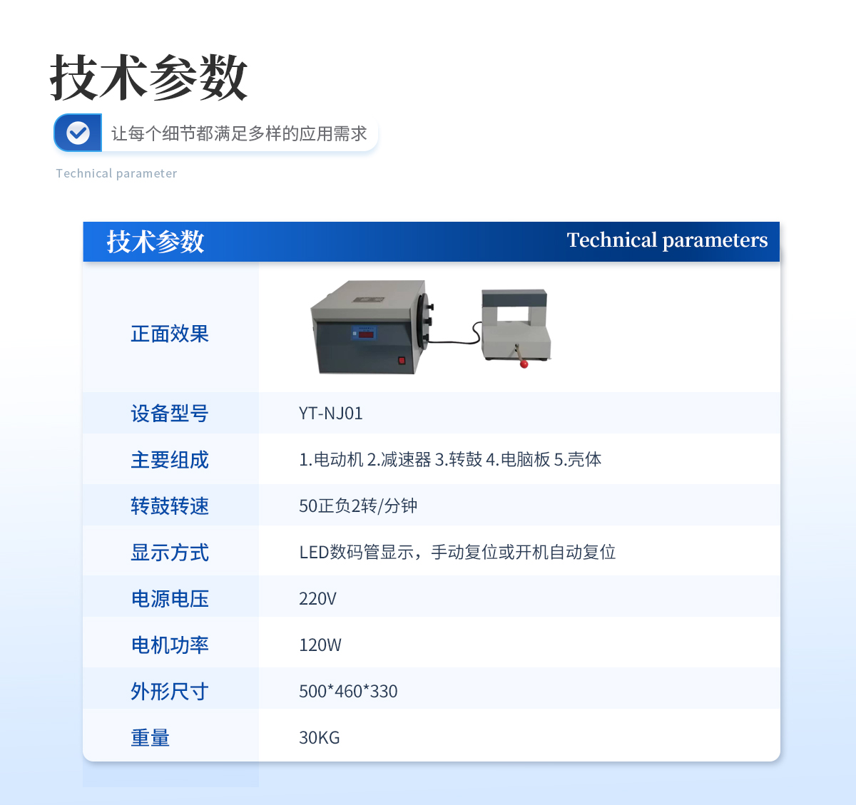 | 1.轉(zhuǎn)鼓轉(zhuǎn)速 50正負2轉(zhuǎn)/分鐘 | 2.顯示方式 LED數(shù)碼管顯示,手動復位或開機自動復位 | 3.電源電壓 220V | 4.電機功率 120W | 5.外形尺寸 500*460*330 | 6.重量 30KG |