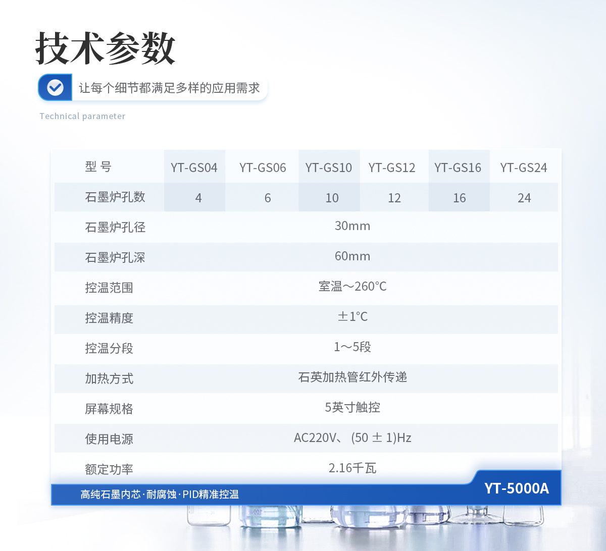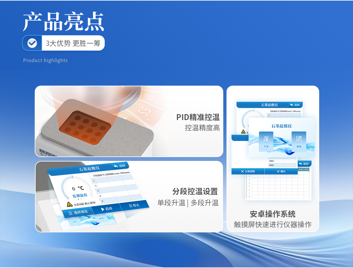 | 使用5寸彩色觸摸屏進(jìn)行儀器操作,配備安卓操作系統(tǒng),方便快捷。 | 采用PID 控溫技術(shù),控溫精度高,升溫速度快, 從室溫到260℃僅需25分鐘。 | 分段控溫設(shè)置,即可單段升溫,也可多段升溫,設(shè)置靈活,儀器將自動(dòng)按順序完成。更適于易產(chǎn)生泡沫的樣品。 | 采用優(yōu)質(zhì)石墨爐內(nèi)芯,平均溫差較小,樣品效果一致性好,熱傳導(dǎo)效率更高。石墨塊具有特氟龍涂層,耐腐蝕,延長(zhǎng)使用壽命。 |