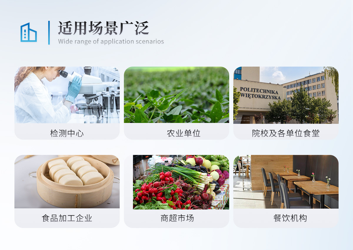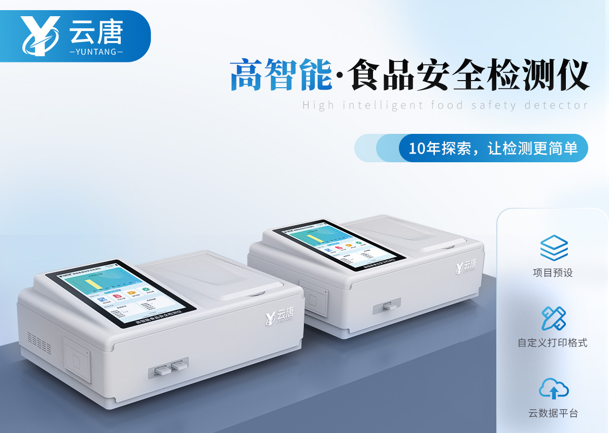 山東云唐智能科技有限公司生產(chǎn)的高智能食品安全檢測(cè)儀為集成化食品安全快速檢測(cè)分析設(shè)備,采用臺(tái)式一體化設(shè)計(jì),可快速檢測(cè)200多種食品安全項(xiàng)目,包含非食用化學(xué)物質(zhì)、濫用食品添加劑、農(nóng)藥殘留、獸藥殘留、重金屬、病害肉、營(yíng)養(yǎng)強(qiáng)化劑、抗生素類殘留、激素類殘留、真菌毒素類殘留、化學(xué)類殘留等項(xiàng)目的定性定量檢測(cè)。目前廣泛應(yīng)用于市場(chǎng)監(jiān)管局、檢測(cè)中心、衛(wèi)生監(jiān)督部門、農(nóng)業(yè)部門、院校及各單位食堂、食品肉產(chǎn)品深加工企業(yè)、商超市場(chǎng)、司法部門、餐飲機(jī)構(gòu)、養(yǎng)殖場(chǎng)、屠宰場(chǎng)、檢驗(yàn)檢疫部門等單位。