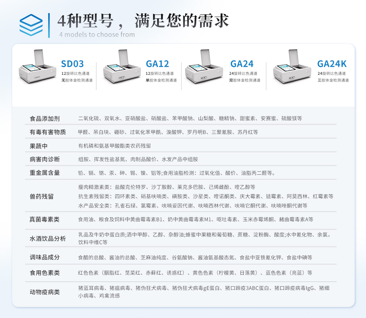 食品添加劑:二氧化硫、雙氧水、亞硝酸鹽、硝酸鹽、苯甲酸鈉、山梨酸鉀、糖精鈉、甜蜜素、木耳硫酸鎂等 | 有毒有害物質(zhì):甲醛、吊白塊、硼砂、過(guò)氧化苯甲酰、溴酸鉀、羅丹明B、三聚氰胺、蘇丹紅、工業(yè)堿、尿素、明礬等 | 果蔬:農(nóng)藥殘留(酶抑制率法) | 病害肉:組胺、揮發(fā)性鹽基氮 | 重金屬含量:鉛、鎘、鉻、汞、砷、錫、鎳、鋁等 | 水酒飲品分析:酒中甲醇、乙醇、乳品及牛奶中蛋白質(zhì) | 調(diào)味品成分: 食醋的總酸、醬油的總酸、芝麻油純度、谷氨酸鈉、醬油氨基酸態(tài)氮、食鹽中亞鐵氰化鉀、食鹽中碘等 | 食用色素類:紅色色素(胭脂紅、莧菜紅、莧菜紅)、黃色色素(檸檬黃、日落黃)、藍(lán)色色素(亮藍(lán))等 | 蜂蜜成分:果糖和葡萄糖、蔗糖、淀粉酶、酸度等 | 食用油脂:過(guò)氧化值、酸價(jià)等 |