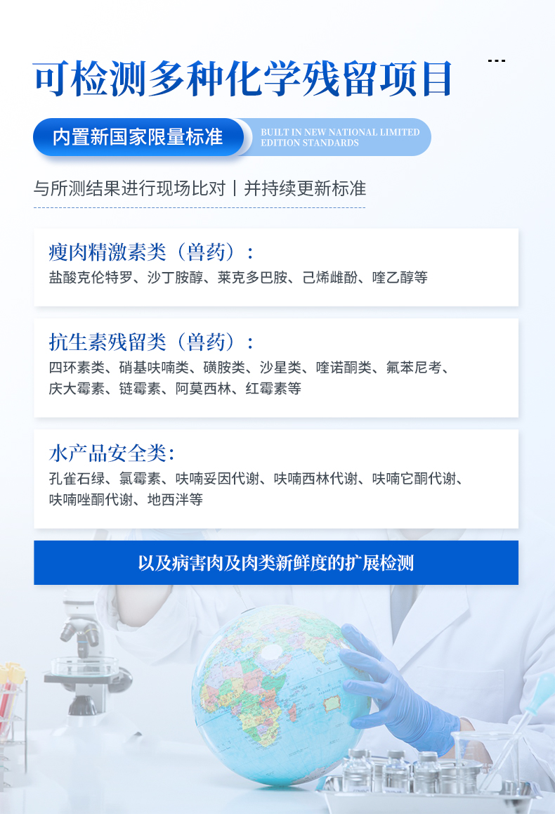 瘦肉精檢測儀可現(xiàn)場快速檢測鹽酸克倫特羅、萊克多巴胺、沙丁胺醇、己烯雌酚、喹乙醇等。儀器預留其他項目檢測程序和端口,根據(jù)日后需求可方便的自主增加檢測項目。日后可升級為檢測抗生素、獸藥殘留、動物疫病、病害肉、的綜合類型儀器
