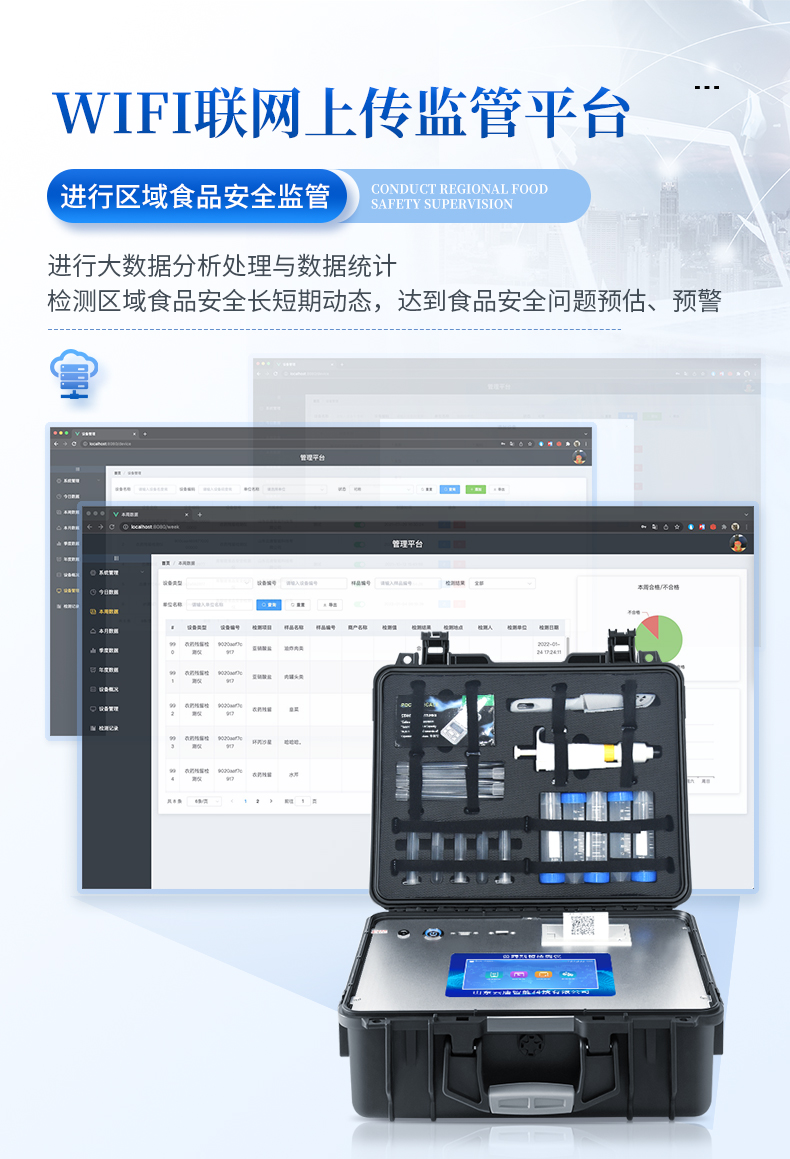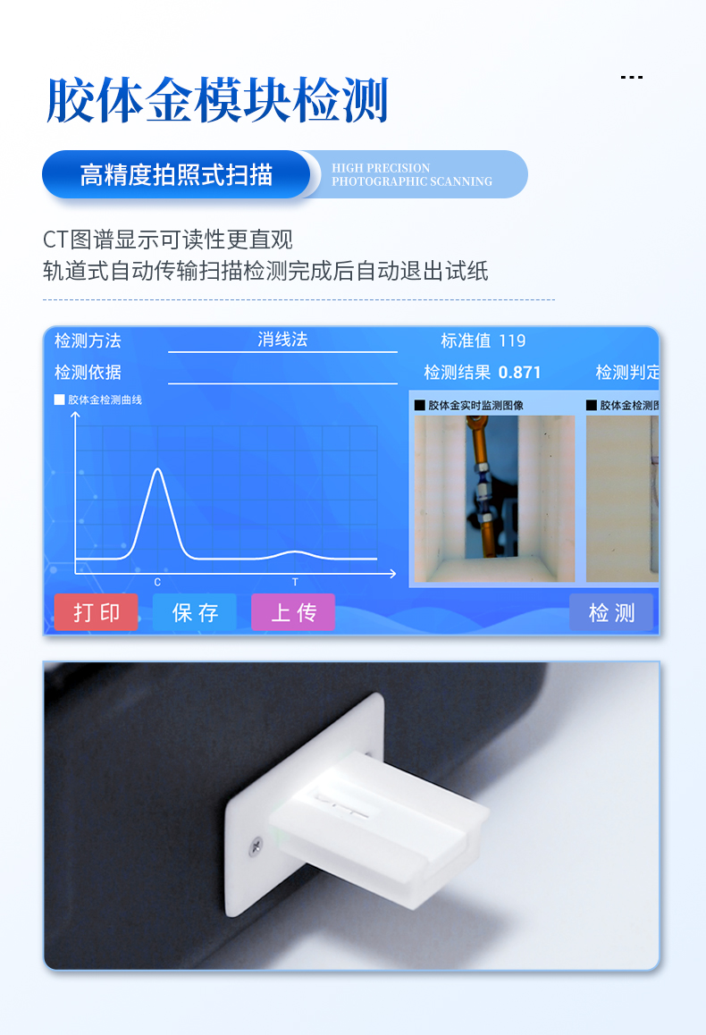 | 安卓智能操作系統(tǒng),采用更加**和人性化操作,儀器具有wifi聯(lián)網(wǎng)上傳、4G聯(lián)網(wǎng)傳輸、GPRS無線遠傳、網(wǎng)線連接功能,快速上傳數(shù)據(jù)。 | 智能化程度高,儀器具有自檢功能:具有開機自檢和調(diào)零功能,具有自動檢測重復性功能。 | 新一代高速熱敏打印機,檢測完成可自動打印檢測報告和二維碼。 | 儀器帶有監(jiān)管平臺,數(shù)據(jù)可局域網(wǎng)和互聯(lián)網(wǎng)數(shù)據(jù)上傳,檢測結(jié)果直接傳至食品安全監(jiān)管平臺。進行區(qū)域食品安全監(jiān)管及大數(shù)據(jù)分析處理與數(shù)據(jù)統(tǒng)計,檢測區(qū)域食品安全長短期動態(tài),達到食品安全問題預估、預警 | 一體化便攜式快檢設(shè)備,滿足現(xiàn)場及流動檢測使用需求,能夠在同一軟件下實現(xiàn)所有檢測項目的檢測,并可通過同一窗口直觀顯示檢測結(jié)果。 | 膠體金模塊檢測方式:軌道式自動傳輸掃描,檢測完成后自動退出檢測卡。 | 儀器內(nèi)置攝像頭拍照,可顯示金標卡實時圖像,系統(tǒng)自動分析并呈現(xiàn)出CT曲線圖,CT線自動識別,無需手動調(diào)整。 | 儀器具有品類多種類樣品菜單庫,可靈活選擇檢測樣品,不同的檢測通道可同時檢測不同的樣品項目。 | 樣品處理簡單省力,整體操作快速、安全、便捷。 | 高靈敏度,高檢測精度,高重復性精度,掃描式高精度光學傳感器。 | 內(nèi)置強大的數(shù)據(jù)庫,可在儀器上直接選擇樣品名稱、檢測指標、送檢單位等信息,也可在儀器上直接編輯錄入樣品名稱、檢測指標、送檢單位等信息并保存進樣品數(shù)據(jù)庫。 | 儀器具有自身保護功能,可設(shè)置用戶名及密碼,防止非工作人員操作等。 | 儀器具有重新校準、鎖定、恢復出廠設(shè)置功能。 | 結(jié)果判定線可修改,對照值標定值可保存,斷電不丟失數(shù)據(jù)。 | 兼容市場上所有的膠體金卡,使用耗材不受限制,極大增強用戶使用體驗。 |