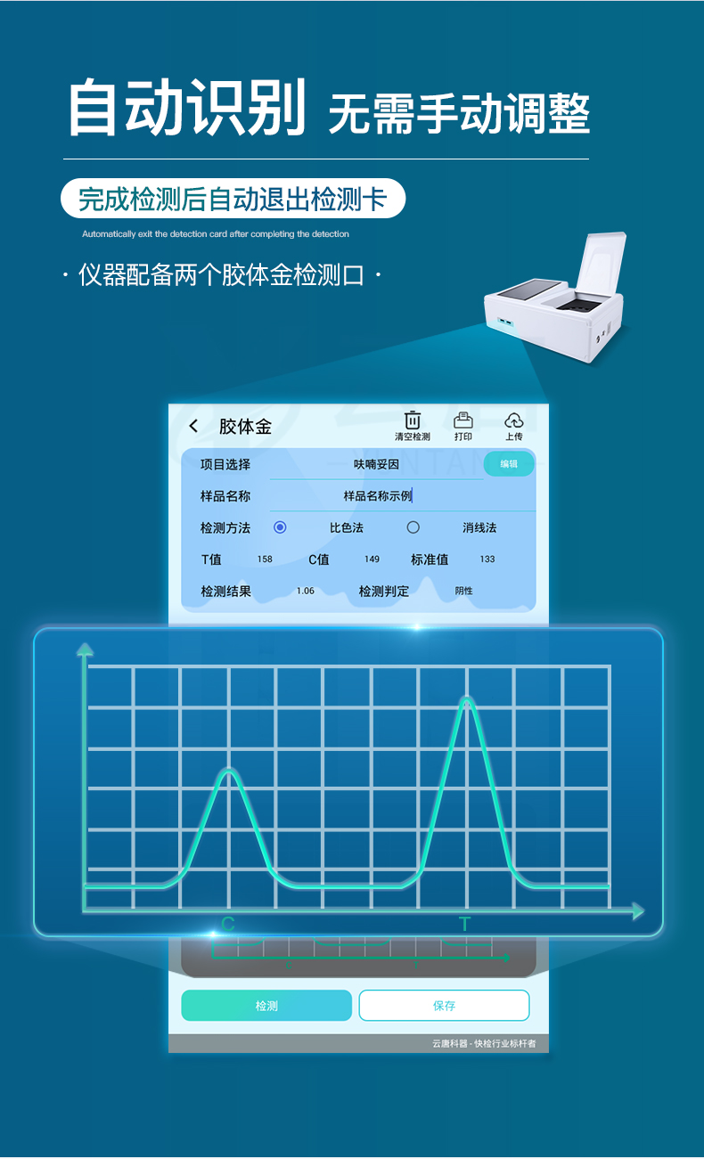 ★采用COMS實(shí)時(shí)成像技術(shù),可采集多個(gè)畫面,支持2個(gè)金標(biāo)同時(shí)讀卡,通過(guò)不同顏色的灰度變化,一秒精準(zhǔn)得出結(jié)果。
