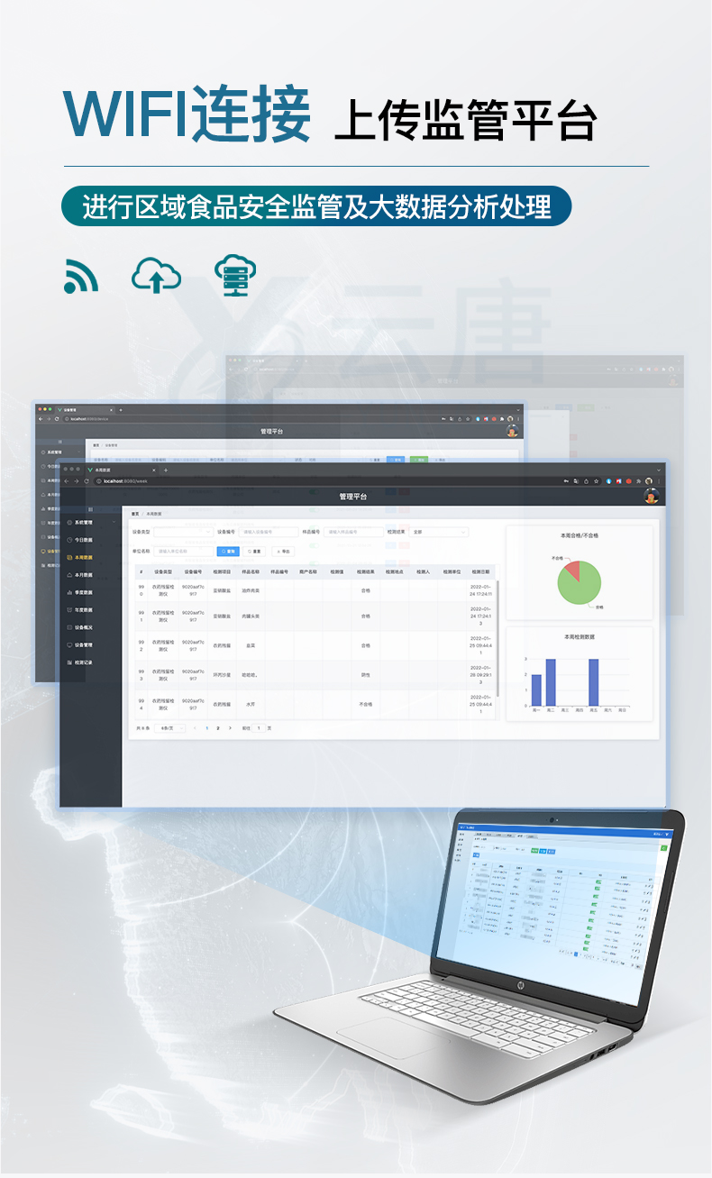 ★數(shù)據(jù)監(jiān)管系統(tǒng):同步對(duì)接監(jiān)管平臺(tái),數(shù)據(jù)可局域網(wǎng)和互聯(lián)網(wǎng)數(shù)據(jù)上傳,檢測(cè)結(jié)果可選擇直接傳至食品安全監(jiān)管平臺(tái)。集成OSS輸出存儲(chǔ)服務(wù)、區(qū)分設(shè)備定向管理應(yīng)用,進(jìn)行區(qū)域食品安全監(jiān)管及大數(shù)據(jù)分析處理與數(shù)據(jù)統(tǒng)計(jì),檢測(cè)區(qū)域食品安全長(zhǎng)短期動(dòng)態(tài),達(dá)到食品安全問(wèn)題預(yù)估、預(yù)警。