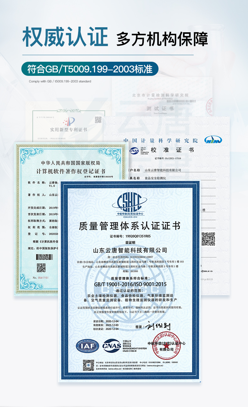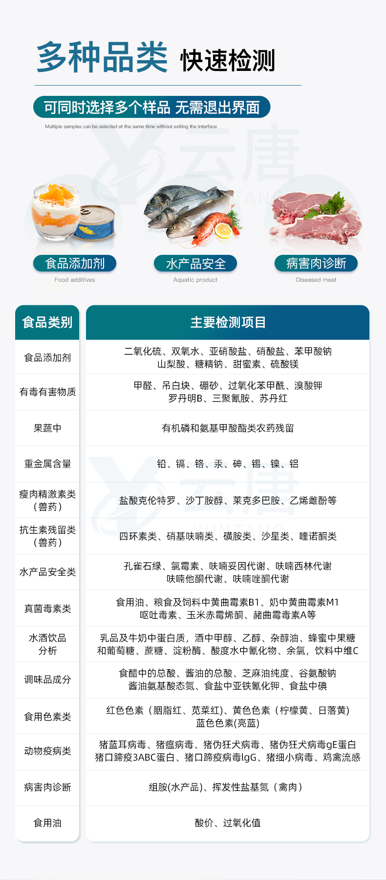 山東云唐智能科技有限公司生產(chǎn)的高智能食品安全檢測(cè)儀為集成化食品安全快速檢測(cè)分析設(shè)備,采用臺(tái)式一體化設(shè)計(jì),可快速檢測(cè)200多種食品安全項(xiàng)目,包含非食用化學(xué)物質(zhì)、濫用食品添加劑、農(nóng)藥殘留、獸藥殘留、重金屬、病害肉、營(yíng)養(yǎng)強(qiáng)化劑、抗生素類殘留、激素類殘留、真菌毒素類殘留、化學(xué)類殘留等項(xiàng)目的定性定量檢測(cè)。