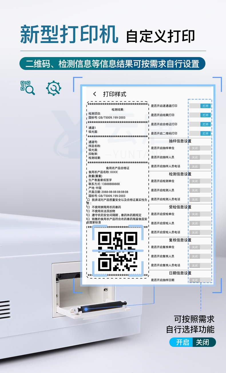 ★自定義打印系統(tǒng):內(nèi)置全新打印系統(tǒng),新創(chuàng)自定義打印方式,可按需靈活設(shè)置開(kāi)啟或關(guān)閉:產(chǎn)品合格證(國(guó)家農(nóng)業(yè)部標(biāo)準(zhǔn)要求),二維碼,抽樣信息、檢測(cè)信息,受檢信息、復(fù)核信息、抽樣日期、檢測(cè)日期等信息的打印。
