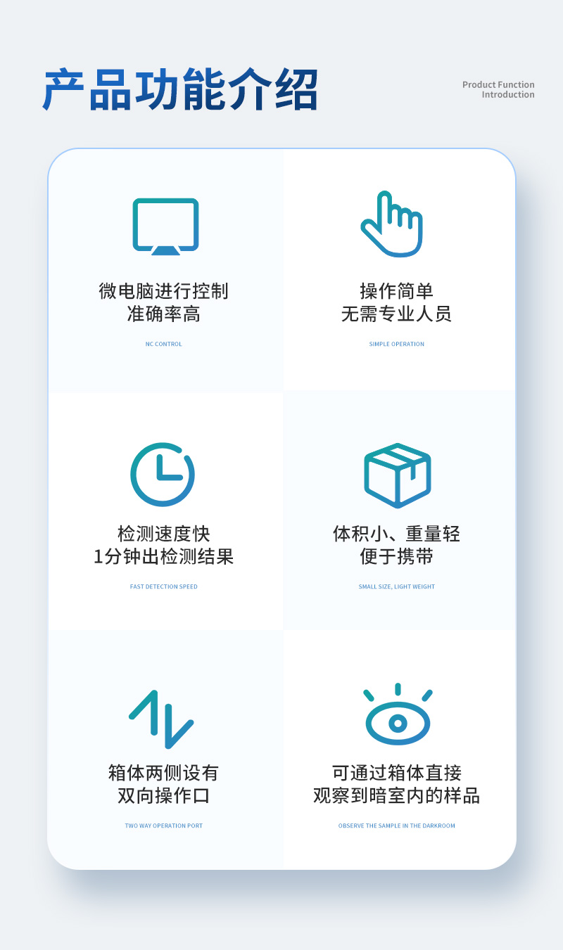 | ★1、采用微電腦進(jìn)行控制,準(zhǔn)確率高 | ★2、操作簡(jiǎn)單,無(wú)需專(zhuān)業(yè)人員 | ★3、檢測(cè)速度快,1分鐘出檢測(cè)結(jié)果 | ★4、體積小、重量輕、便于攜帶 |