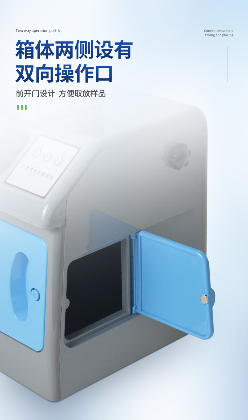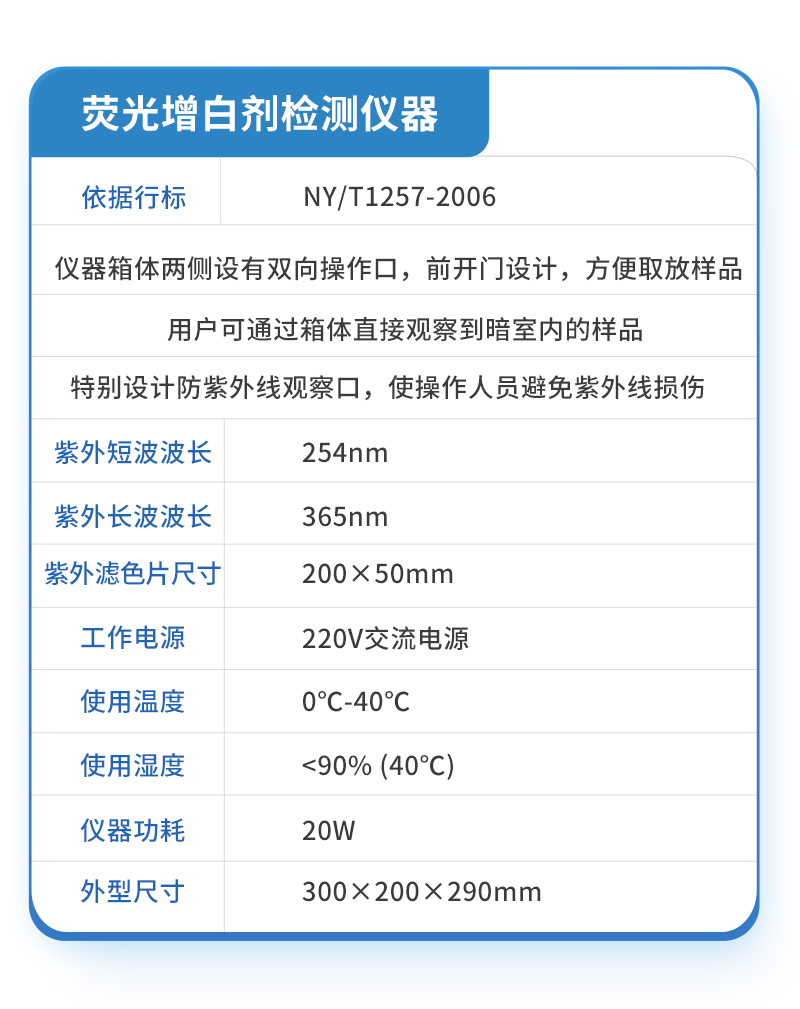 | ★依據(jù)行標(biāo):NY/T1257-2006 | ★儀器箱體兩側(cè)設(shè)有雙向操作口,前開(kāi)門(mén)設(shè)計(jì),方便取放樣品。 | ★用戶可通過(guò)箱體直接觀察到暗室內(nèi)的樣品。 | ★特別設(shè)計(jì)防紫外線觀察口,使操作人員避免紫外線損傷。 | ★紫外短波波長(zhǎng):254nm | ★紫外長(zhǎng)波波長(zhǎng):365nm | ★可見(jiàn)光源 | ★紫外濾色片尺寸:200×50mm | ★工作電源: 220V交流電源 | ★使用溫度: 0℃-40℃ | ★使用濕度:<90% (40℃) | ★儀器功耗: 20W | ★外型尺寸:300×200×290mm |