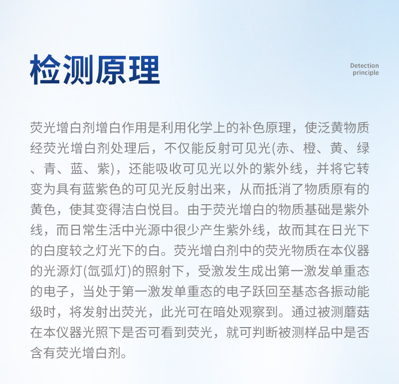 | 熒光增白劑是一種熒光染料,或稱(chēng)為白色染料,也是一種復(fù)雜的有機(jī)化合物。它的特性是能激發(fā)入射光線產(chǎn)生熒光,使所染物質(zhì)獲得類(lèi)似熒石的閃閃發(fā)光的效應(yīng),使肉眼看到的物質(zhì)很白,達(dá)到增白的效果;雖然目前沒(méi)有證明熒光劑吸收多少會(huì)對(duì)人體造成傷害,但是熒光增白劑已被列為潛在致癌因素之一,嚴(yán)禁在食品加工中使用;近年來(lái),部分經(jīng)銷(xiāo)商為了使一些價(jià)值較高的食用菌(如雙孢蘑菇、雞腿菇)增白、護(hù)色,延長(zhǎng)貨架期,在銷(xiāo)售前違法使用熒光增白劑或含有該成分的保鮮劑,造成浸染污染。此外,某些食用菌(如白靈菇),由于所用包裝紙是增白劑處理過(guò)的,造成沾染污染。 | 該熒光增白劑檢測(cè)儀:依據(jù)農(nóng)業(yè)部行業(yè)標(biāo)準(zhǔn):NY/T1257-2006《食用菌中熒光物質(zhì)的快速檢測(cè)》進(jìn)行研發(fā),可廣泛應(yīng)用于食用菌或含有熒光增白劑成分作為保鮮劑的農(nóng)產(chǎn)品質(zhì)量安全的快速檢測(cè);適用于農(nóng)產(chǎn)品檢測(cè)單位、工商部門(mén)檢測(cè)取證,同時(shí)也適用于農(nóng)產(chǎn)品貿(mào)易市場(chǎng)、超市、大中學(xué)校、賓館酒家、以及經(jīng)銷(xiāo)商自檢。 |
