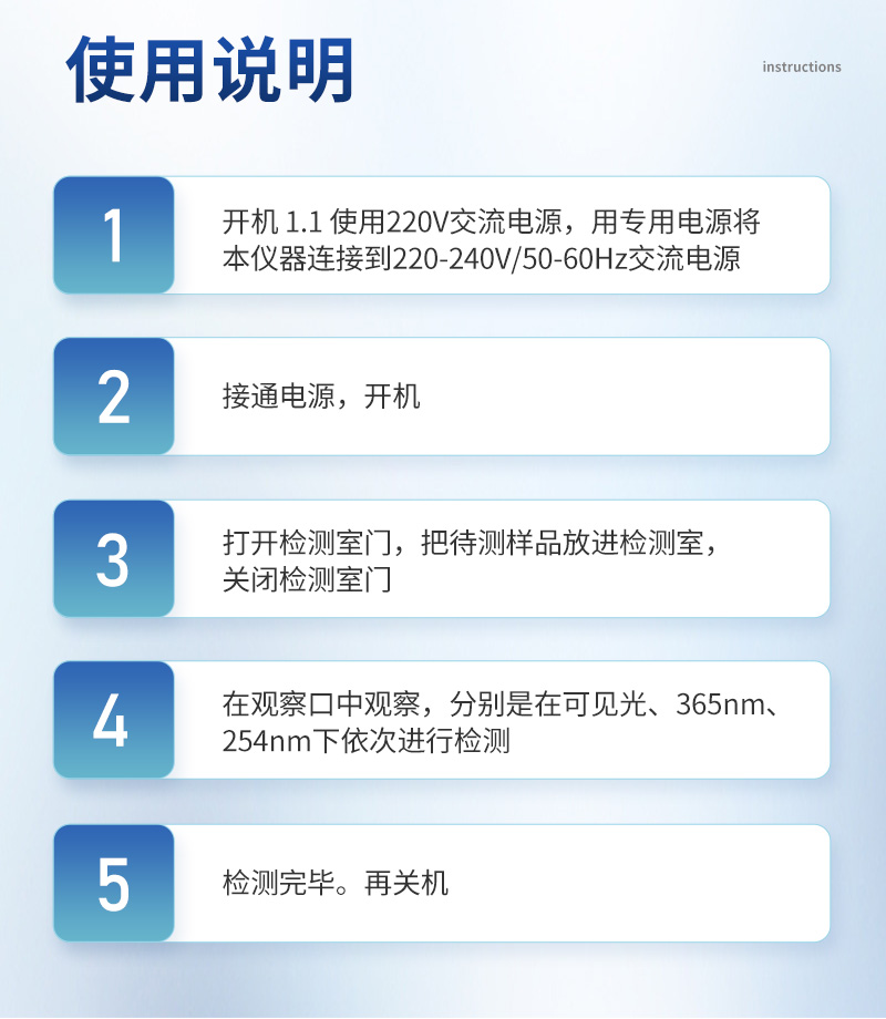 | 1、開(kāi)機(jī) 1.1 使用220V交流電源,用專(zhuān)用電源將本儀器連接到220-240V/50-60Hz交流電源。 | 2、操作程序 | 2.1 接通電源,開(kāi)機(jī) | 2.2 打開(kāi)檢測(cè)室門(mén),把待測(cè)樣品放進(jìn)檢測(cè)室,關(guān)閉檢測(cè)室門(mén) | 2.3 在觀察口中觀察,分別是在可見(jiàn)光、365nm、254nm下依次進(jìn)行檢測(cè)。 | 2.4 檢測(cè)完畢。再關(guān)機(jī)。 |