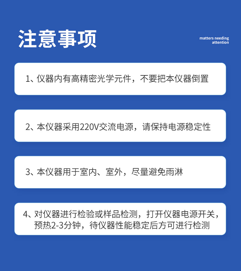 | 1. 儀器內(nèi)有高精密光學(xué)元件,不要把本儀器倒置 | 2. 本儀器采用220V交流電源,請(qǐng)保持電源穩(wěn)定性 | 3. 本儀器用于室內(nèi)、室外,盡量避免雨淋 | 4. 對(duì)儀器進(jìn)行檢驗(yàn)或樣品檢測(cè),打開(kāi)儀器電源開(kāi)關(guān),需預(yù)熱2-3分鐘,待儀器性能穩(wěn)定后方可進(jìn)行檢測(cè) |